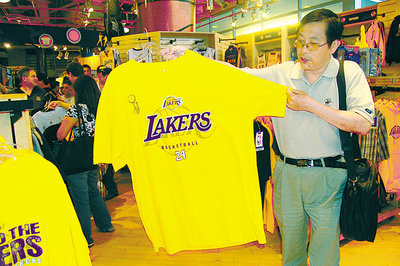 隨旅行團從中國南方赴美旅游的李先生為趕上湖人隊二連霸感到幸運,在湖人隊用品專賣店買了十頂帽子,準備回國后送給親友。