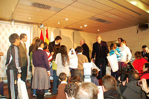 中新網(wǎng)12月26日電 據(jù)西班牙《歐華報(bào)》報(bào)道,由皇馬基金會發(fā)起“每個(gè)孩子都有玩具”的活動,日前在馬德里伯納烏球場內(nèi)舉行;蜀R現(xiàn)役超級球星卡卡,及退役球星齊達(dá)內(nèi)到場給馬德里兒童代表送出“第一份”圣誕節(jié)禮物。毛尚雅等4名華裔小朋友作為馬德里華僑子女代表,參觀了皇馬博物館、伯納烏球場及球員休息室等地,并在活動中上臺領(lǐng)取禮物,接受電視臺采訪。