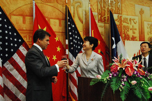 高燕平總領事在招待會上分別用中文和英語致辭,對佩里州長以及來自德州各界的美國朋友及華裔同胞表示熱烈的歡迎。這次世博會德克薩斯州將通過世博園里的美國館,向全中國和全世界展現自己。高燕平表示希望通過佩里州長6月份的訪華,進一步推動中國與德州在各領域的交流與合作,希望佩里州長的訪問順利成功并富有成果。