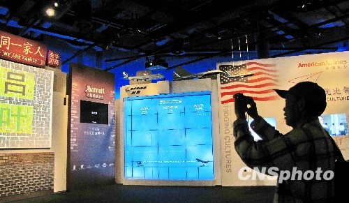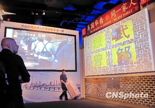 2010年5月12日,美國(guó)華裔精英組織“百人會(huì)”發(fā)起的“美國(guó)華裔——同一家人”展覽,在上海世博會(huì)美國(guó)館展出。一萬多張不同年齡、職業(yè)和出生地的美國(guó)華裔的頭像以照片、視頻的形式在 “百姓墻”上展出,全部照片按中文姓氏的編排不停切換畫面,形成一條串聯(lián)起美國(guó)華裔和中國(guó)參觀者的情感紐帶。 中新社發(fā) 井韋 攝