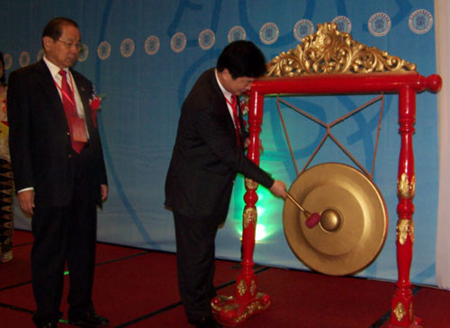 雅加達興安會館會長關(guān)文龍帶領(lǐng)中共莆田市委書記楊根生上臺為今次第五屆世界興安同鄉(xiāng)懇親大會暨第五屆世界莆商大會鳴鑼示意,宣布大會的正式開始。