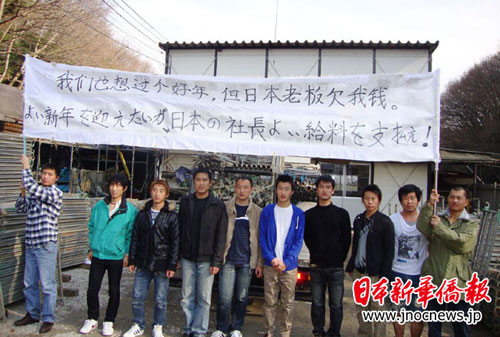 中新網12月31日電 據日本新華僑報網報道,“我們也想過個好年,但日本老板欠我的錢!”12月30日上午,十名來自東北的在日中國實習生在他們的住地前打出雙語橫幅,憤怒譴責他們所在的“健陽”株式會社的日本老板拖欠工資的行為。