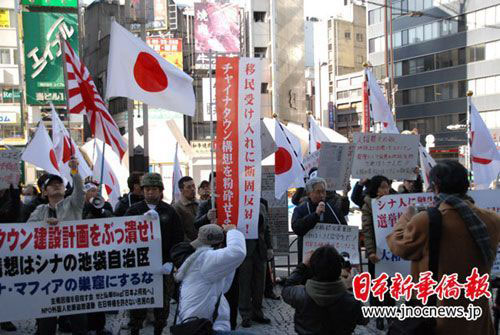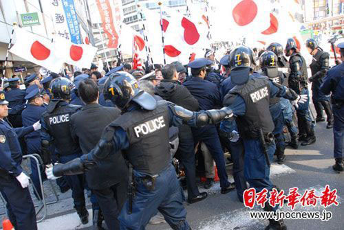面對(duì)右翼分子的叫囂,“陽光城”的華人員工顯得非常沉著冷靜,依然熱情接待來到這里的每一位客人。在現(xiàn)場,日本警方也積極維護(hù)華人不受傷害。右翼分子在講演中攻擊中國留學(xué)生,一位中國女留學(xué)生勇敢地站出來,大聲說:“我是中國人,是中國留學(xué)生,你們都是‘右翼垃圾’!”當(dāng)右翼分子要對(duì)這名女學(xué)生動(dòng)手時(shí),警員立即沖過來加以保護(hù)。