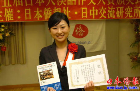 日本麗澤大學中文系三年級學生川松若菜的作文抓住“赴日中國游客激增”這一現實,以“致訪問日本的中國旅行者”為題,給中國游客提出了溫馨的提示和建議,獲得中國駐日使館程永華大使簽署的“中國大使獎”。