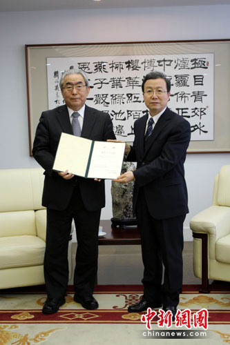 4月16日上午,中國駐日本大使程永華在官邸接受了日本永旺株式會社向中國青海玉樹地震災區捐助的1000萬日元善款。