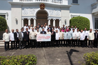 菲律賓商聯(lián)總會理事長黃禎潭、菲華各界聯(lián)合會主席戴宏達一行4日上午來到中國駐菲使館,親手向劉建超大使遞交了由這兩個菲華社團發(fā)動當(dāng)?shù)厝A人華僑為玉樹災(zāi)區(qū)籌得的善款3287.7萬比索(約合500萬元人民幣)。