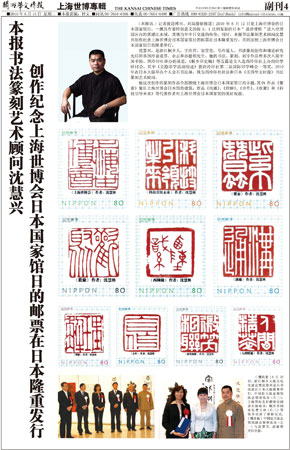 中新網(wǎng)6月12日電 據(jù)日本《關(guān)西華文時報》報道,6月12日是上海世博會的日本國家館日,一艘具有著特別意義的按1:1比例復(fù)制的日本“遣唐使船”進(jìn)入世博園區(qū)內(nèi)的黃浦江水域,重現(xiàn)當(dāng)年中日交流的傳奇;同時,該報書法篆刻藝術(shù)顧問沈慧興創(chuàng)作紀(jì)念上海世博會日本國家館日的郵票在日本隆重發(fā)行,共同慶祝上海世博會日本國家館日的隆重舉行。