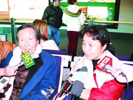 劉面換身穿傳統(tǒng)中式棉襖、藍(lán)色外套和白色圍巾出現(xiàn),雖然經(jīng)過十多小時(shí)的飛行,精神看起來(lái)仍然不錯(cuò)。前往接機(jī)的史維會(huì)共同主席列國(guó)遠(yuǎn),特別送上紅色大圍巾予以御寒。