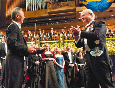 中新網12月11日電 2009年諾貝爾獎頒獎禮昨在瑞典斯德哥爾摩演奏廳舉行,一生獲獎無數的光纖之父、前香港中文大學校長高錕,正式從瑞典國王古斯塔夫.卡爾16世(Carl XVI Gustaf)手中接過諾貝爾物理學獎。期間大會更為他作出特別安排,由國王走到其座位旁邊頒獎,盛裝出席的他,以燦爛的笑容迎接氣氛莊嚴但歡樂的歷史性一刻。