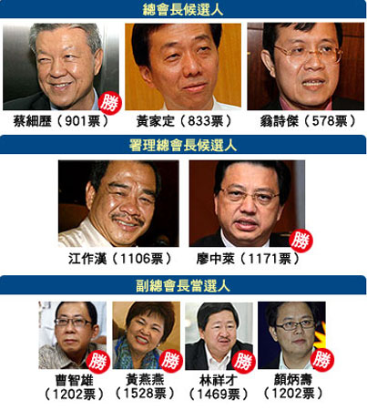 至于引起10角大混戰的副總會長職,隸屬蔡細歷派,尋求蟬聯的黃燕燕此次以高票成功捍衛原職,也是最高票副總會長。而選前被視為“左右縫源”的前副總會長林祥才則位居第二,黃家定派的曹智雄及翁詩杰派的顏炳壽則同樣雙雙擠入副總會長行列,而顏炳壽的入圍更被視為是“黑馬”。