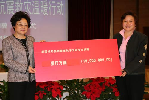 3、美國(guó)成功集團(tuán)董事長(zhǎng)李玉玲捐贈(zèng)1000萬元人民幣;