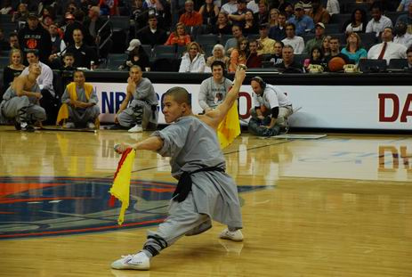 中場休息期間在全場觀眾經久不息地助威聲下,費佛爾大學孔子學院邀請的4位功夫大師由愛美麗·羅德女士率領步入球場中央,功夫大師們恭謹地向全場觀眾行佛禮。這時賽場主持人以NBA式的渾厚嗓音向現場觀眾發布: “讓我們熱烈歡迎今晚的特別嘉賓,費佛爾大學孔子學院少林功夫大師,他們給我們帶來了擁有1700年歷史的中國地道的少林功夫。”