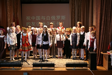 在學校禮堂,已經精心準備了一臺以“新中國成立60周年”為主題的文藝節目。在“中白友誼萬古長青”的屏幕背景下,孩子們用稚嫩的童音朗讀了唐詩《詠鵝》和《靜夜思》,用質樸的歌聲演唱了兒歌《兩只老虎》,表演了專門從中國電影里學來的民間舞蹈,并邀請中國阿姨上臺共唱《歌聲與微笑》。“請把我的歌兒帶回你的家,請把你的微笑留下。”這充滿感情的歌聲把歡樂的氣氛推向高潮。