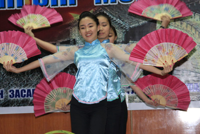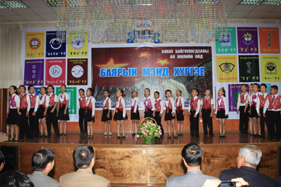 中新網9月27日電 據中國外交部網站消息,9月25日,為慶祝中華人民共和國成立60周年暨中蒙兩國建交60周年,蒙古首都教育局組織全市開設漢語教學課程的16所中小學校的師生,精心準備了一場有歌唱、舞蹈、柔術、器樂表演等多個節目的精彩演出。中國駐蒙古使館參贊王福康等全體館員、蒙古首都教育局局長恩赫巴雅爾及上述各校校長觀看了演出。