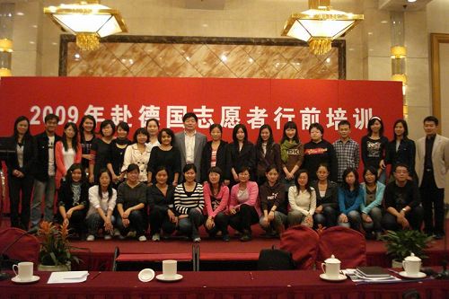 國(guó)家漢辦12日為該批志愿者組織了行前培訓(xùn)并為他們送行。志愿者中心主任薛華領(lǐng)勉勵(lì)志愿者們繼承漢語(yǔ)教師志愿者兢兢業(yè)業(yè)、克己奉獻(xiàn)的優(yōu)良作風(fēng),發(fā)揚(yáng)志愿精神,高標(biāo)準(zhǔn)要求自己,做好志愿服務(wù)工作。同時(shí)也希望志愿者們牢記漢語(yǔ)教師志愿者的“光榮感、責(zé)任感、使命感”,進(jìn)一步提高自身素質(zhì),關(guān)心國(guó)家大事,在新中國(guó)60華誕之際,抓住機(jī)遇,展示祖國(guó)的偉大成就,為中德友好交流做出貢獻(xiàn)。志愿者們紛紛表示,祖國(guó)的崛起與富強(qiáng)堅(jiān)定了他們當(dāng)好文化傳播民間使者的信心和決心,激勵(lì)著他們投身到漢語(yǔ)國(guó)際推廣事業(yè)的最前沿隊(duì)伍中去,把工作做得更好、更精彩。