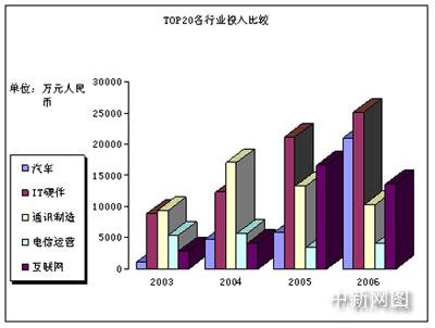 現在的情況是怎么樣呢?整個中國市場的網絡廣告投放額在增加,但以前那種一家獨大的情況不見了。更多的企業主體參與進來了。從下面的網絡廣告TOP20各行業投入比較表中可以看到,在2006年,汽車已經超越了互聯網企業,成為對網絡廣告貢獻比例最大的行業之一,僅僅次于IT硬件產業。