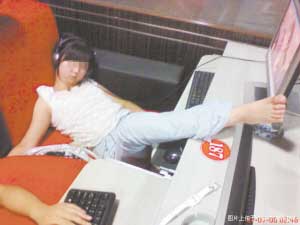 在這些被張貼出來的照片中,記者看到,有個漂亮妹妹戴著耳機不知道是在瞇著眼睛聽音樂還是已經睡著了,一條腿放在電腦桌上;大多數上網者要么蜷縮在沙發上要么就坐在凳子上酣然熟睡;有的上網者手放在鍵盤上,可眼睛卻已經閉上,嘴巴大張著;還有的則是男女混合躺在一起,任憑電腦屏幕閃個不停。