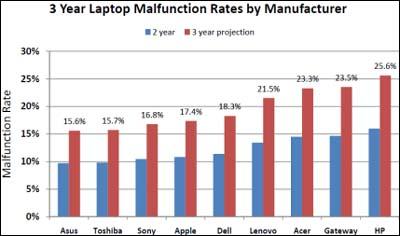 整體而言,在三年內,25%的上網本會出現故障,而入門級筆記本的故障率為20.6%,高端筆記本故障率為18.1%。