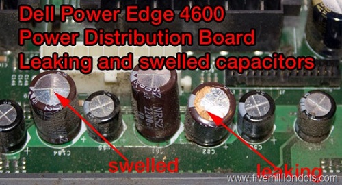 第一臺是PowerEdge 4600托管服務器,首先是四個熱插拔電源之中的一個出現問題,導致服務器宕機。拆除問題電源后,利用其他三個電源繼續運轉了9個月時間。結果又有一個電源出現問題。打開機箱后發現,控制電源系統的主板部分的電容器出現了膨脹,泄露。