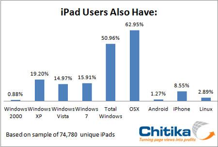 Chitika對(duì)7萬(wàn)多名iPad用戶(hù)進(jìn)行了調(diào)查,結(jié)果發(fā)現(xiàn)有50.96%的用戶(hù)使用Windows系統(tǒng)。當(dāng)然,使用Mac OS系統(tǒng)的iPad用戶(hù)略占上風(fēng),比例為62.95%(部分用戶(hù)使用雙系統(tǒng))!
