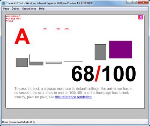 同時,微軟還提供了IE9第二預覽版的一些測試結果。在Acid 3測試中,新版瀏覽器得到了68分,高于首個版本。