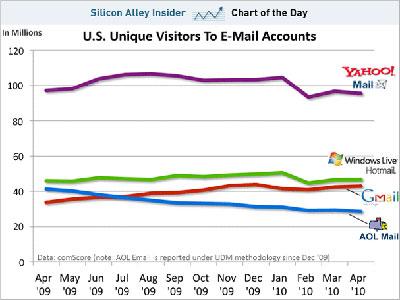 comScore數據顯示,今年4月,雅虎電子郵件用戶數量仍高居榜首,微軟Hotmail位居第二,但用戶數量僅為雅虎用戶數量的一半。
