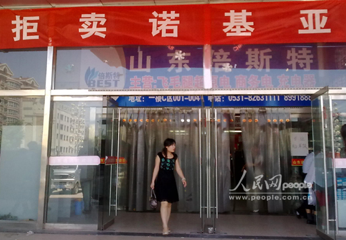 諾基亞與經銷商的矛盾持續發酵,迅速在全國各地蔓延。繼杭州經銷商抗議諾基亞對竄貨課以重罰,打出要求諾基亞歸還血汗錢的橫幅后,今天山東諾基亞經銷商再度發飆,在濟南市場山東通訊城打出《拒賣諾基亞》的條幅。