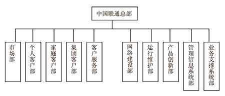 借電信重組契機,中國聯通也對組織架構進行了調整。在重組之前,原中國聯通的前臺部門有G網經營部、增值業務部、數據固定業務部等,原中國網通有增值業務中心、公話業務管理中心、綜合信息業務中心、區域銷售管理中心等;重組之后,中國聯通成立了個人客戶部、家庭客戶部、集團客戶部,這些部門與市場部級別平行,具體如圖所示。