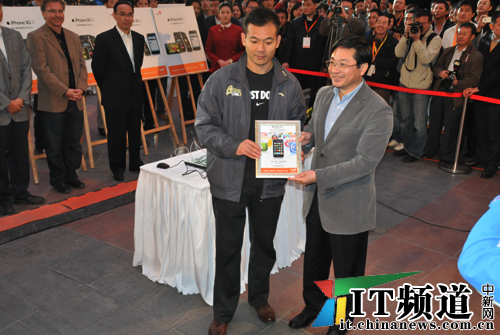 中新網(wǎng)10月30日電 下午6點(diǎn),中國聯(lián)通iPhone手機(jī)正式在中國市場發(fā)售。中國聯(lián)通副總經(jīng)理李剛現(xiàn)場售賣第一臺(tái)iPhone,同時(shí)中國聯(lián)通高層向現(xiàn)場購得手機(jī)的第一位機(jī)主頒發(fā)證書。