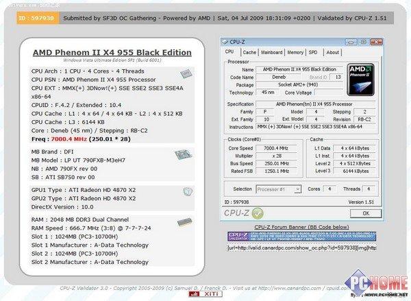 本周,由AMD特別提供的極品特供處理器Phenom II 42 TWKR在開啟四顆核心的情況下,成功沖擊了7GHz大關,創造了4核心處理器的最新世界記錄(默認頻率:2.0GHz,超頻幅度達到250%)。
