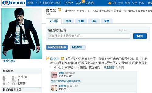 人人網(wǎng)明星主頁上的眾多明星們:光良、尚雯婕、游鴻明、段奕宏、王寶強(qiáng)等,還有世界小姐張梓琳和王靜瑤以及以那多為代表的新一代年輕作家都紛紛更新自己的狀態(tài)表示對恩師的問候,有的明星還在主頁上講述自己學(xué)生時(shí)代的趣事,而機(jī)構(gòu)主頁中的《環(huán)球時(shí)報(bào)》和光線傳媒《最佳現(xiàn)場》等也是在主頁上更新了教師節(jié)狀態(tài)以此表示對老師們的敬意。從電話、短信、電子郵件,表達(dá)祝福的方式在不斷演進(jìn),當(dāng)前社交網(wǎng)站因其基于真實(shí)用戶而產(chǎn)生的真實(shí)情感,成為人們表達(dá)祝福的最新選擇。