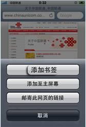 ⑹網頁管理界面主要包括“添加書簽”、“添加制主屏幕”和“郵寄此網頁的鏈接”三個選擇。選擇“添加書簽”按鈕,可將該網頁的網址加到書簽列表中;選擇“添加制主屏幕”按鈕,可形成屏幕快捷鍵;選擇“郵寄此網頁的鏈接”可將該網頁的網址發送給別人。
