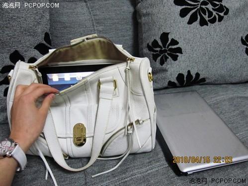 今天拿到iPad,放在包包里和姐妹逛了2小時街,手里提著包包有些重量,但覺得還可以接受,并不是特別沉,但時間長了有點勒手,俗話說“好手難提四兩”。我平時喜歡背大包,可以放很多的東西,經常在地鐵里看到有女孩包包里放小說,有次上班高峰時,看到一個短發MM坐著用EeePC最薄的那款貝殼機帶著耳機看電影,很佩服她的閑情,但也同時發覺確實有很多志同道合的MM喜歡背大包。有人說iPad可以當電子書,地鐵里看電子書的人很多,攜帶是個問題,這里拿自己的包包示范給大家看。