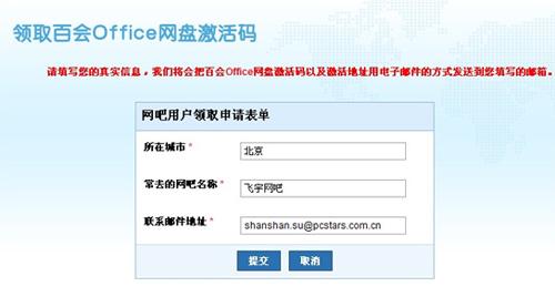 點擊進入,按照提示輸入所在地、常去的網吧名稱、聯系郵箱地址提交后,剩下的工作就是等待百會客服人員將激活碼發送到所填寫的聯系郵箱地址。這里需要提醒,填寫的郵箱地址一定要正確,不然就無法正常的接收到百會Office 5G網盤激活碼了。