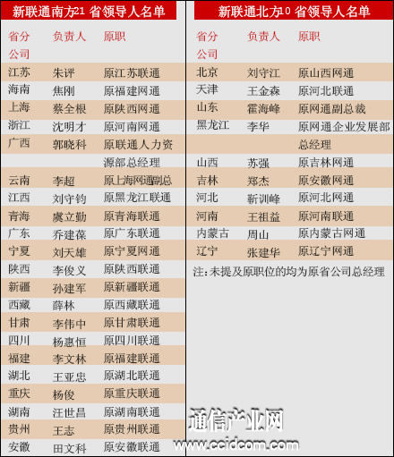 隨著新聯通省、市、縣級組織架構的確定,各省市相關領導已經確定,如原山西網通的總經理劉守江為新聯通北京市分公司負責人,而原湖北聯通總經理王亞忠則仍留任新聯通湖北分公司負責人(詳見上表)。據了解,在新聯通省分公司的負責人中,原聯通與原網通的高管比例基本上為1:1,堅持均衡原則。這也印證了此前中國聯通董事長常小兵的觀點,在新聯通內部機構設置和負責人安排的工作上,主要遵循適應發展需要、確保平穩過渡、兼顧當前及今后、合理均衡配備等四項原則。“在主要負責人的安排上,注重了原中國網通和原中國聯通干部的總體均衡。”常小兵說。