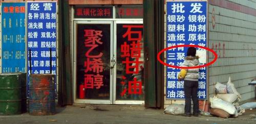 記者在一家化工店招牌上發(fā)現(xiàn)三聚氰胺字樣,老板解釋現(xiàn)在早都沒賣了