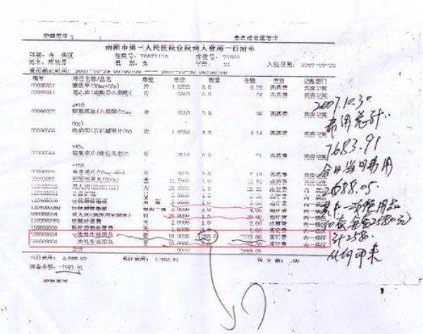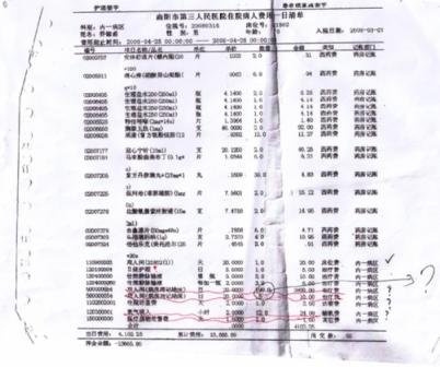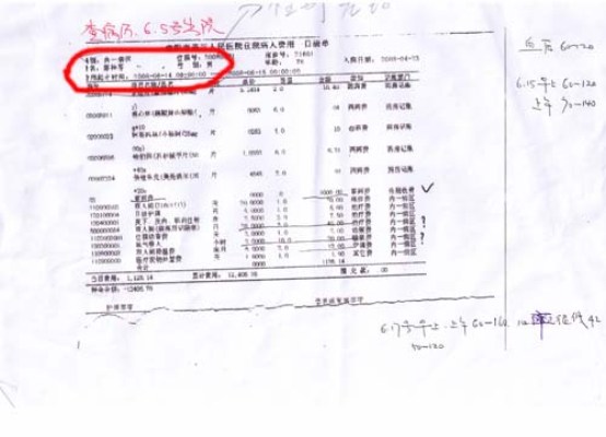 第一份清單是她母親席桂芬的。席桂芬今年80歲,是南陽市商業局的離退休干部,多年來患有高血壓、糖尿病、老年癡呆癥等,近年來經常在南陽市第三人民醫院住院治療。清單顯示的時間為“2007年10月29日至30日(前日零點至次日零點,下同)”,李冰特意在兩行費用上用紅筆作了標記:一次性用品,單價10元,套數258套,合計金額2580元,類別為其他費用。也就是說,在醫療費用之外,席桂芬這一天揮霍掉了258套一次性用品。第二份清單上,時間為:2008年6月14日,其母親的性別變成了“男”。