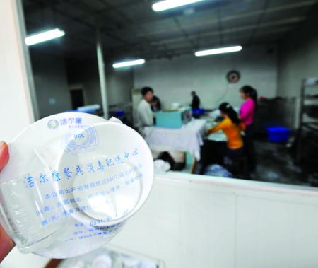 “這些餐具你們自己用不用?”面對工商執法人員的詢問,一名正在清洗“消毒餐具”的女工沉默半晌后搖了搖頭,小聲地說:“我不用!27日中午,接到記者反映的情況后,工商部門查處了位于福州晉安區譚橋村的這家消毒餐具廠。記者看到,這家廠的餐具包裝袋上印著“潔爾康餐具消毒配送中心”字樣。