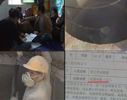 我們可以來(lái)看一下風(fēng)鉆爆破工人作業(yè)的圖片,這些鉆井和地面垂直,深達(dá)幾十米,工人在井底打炮眼,巖石粉塵四處飄散無(wú)法排出井口,環(huán)境十分惡劣。在彭飛平、程動(dòng)云等幾個(gè)工人接連死于塵肺病之后,跟他們一起打工桑植老鄉(xiāng)意識(shí)到了問(wèn)題嚴(yán)重,開始尋求職業(yè)病鑒定。接下來(lái)發(fā)生了什么?