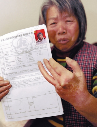 記者看到王桂蘭提供的殘疾證上注明,王桂蘭為三級(jí)肢體殘疾,頒證日期為2002年10月23日。而在最新“中華人民共和國(guó)殘疾評(píng)定標(biāo)準(zhǔn)表(肢體類)”上,記者看到新評(píng)定標(biāo)準(zhǔn):“……雙手拇指或雙手拇指以外其他手指全缺失”可為三級(jí)肢殘,……單手拇指以外其他四指全缺失”可為四級(jí)肢殘。而王桂蘭的左手雖然嚴(yán)重變形,但是還有四個(gè)手指頭,按照這個(gè)標(biāo)準(zhǔn),王桂蘭的確不能算是殘疾。
