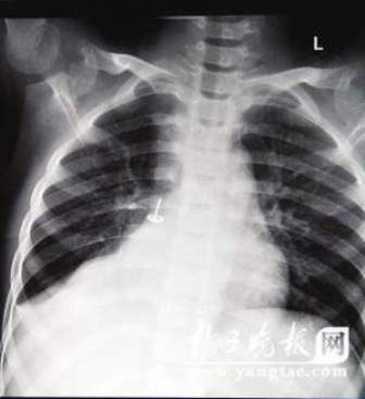 小杰的母親告訴記者,他們一家來(lái)自安徽明光,自己和孩子的父親都在外打工,小杰從小就由爺爺奶奶照顧。從去年夏天開始,爺爺奶奶就告訴他們,小孩身體不好,總是感冒咳嗽。后來(lái)發(fā)展到幾乎每隔一個(gè)星期,小杰就感冒發(fā)燒。從上個(gè)月中旬開始,小杰連著幾天發(fā)低燒,掛了幾天水都?jí)翰幌聛?lái),長(zhǎng)輩們很擔(dān)心,就把小杰的媽媽喊回家里。小杰的媽媽想,孩子反復(fù)感冒也不是個(gè)事兒,于是就把他帶到南京,想找個(gè)專家好好看看。到了南京市兒童醫(yī)院,醫(yī)生詢問(wèn)病史后,建議孩子做一個(gè)胸片看看。結(jié)果片子一出來(lái),所有人都嚇了一跳,孩子的肺里有一個(gè)明顯的金屬物,看這形狀,不就是一個(gè)圖釘嗎!在家長(zhǎng)的追問(wèn)下,小杰才吞吞吐吐地說(shuō),去年3月的一天,他把圖釘含在嘴里面玩,結(jié)果一不小心就吸了下去。但是據(jù)孩子自述,就剛一開始有點(diǎn)疼,過(guò)了一會(huì)就沒(méi)有感覺(jué)了。因?yàn)榕卤患议L(zhǎng)教訓(xùn),他一直沒(méi)敢吱聲。