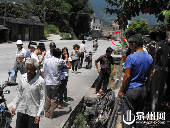 記者昨日上午10時(shí)趕到位于永春達(dá)埔鎮(zhèn)東園村委會(huì)附近的事發(fā)現(xiàn)場(chǎng)時(shí),警方仍在現(xiàn)場(chǎng)勘察。據(jù)了解,死者張某泉今年38歲,家住在距東園村五六公里遠(yuǎn)的錢峰村。“人躺在這個(gè)地方,摩托車卻翻倒在100多米外的水溝里。”張某泉的一位親戚指著路對(duì)面的涼棚告訴記者,張某泉的遺體就停放在那里。