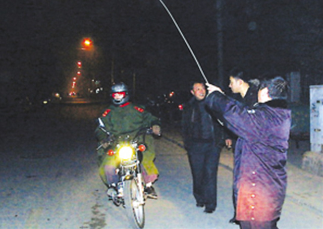 民警告訴記者,這根纜線已經放倒幾位行人,其中受傷嚴重的潘女士脖子被“勒”了,剛去醫院。記者發現,每當有電動車或摩托車經過這里時,民警都會將這根纜線舉起來,讓大家鉆行。民警表示,他們已經通知相關部門前來查看到底是哪家的通訊電纜。