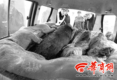 “車底盤被壓得很低,一看就知道裝了不少東西。”西安市公安局經濟開發區分局巡警大隊民警朱顏介紹,當時要求該車靠邊停下檢查時,明顯感覺司機想開車跑,但因車上東西過重,最后才緩緩地靠邊,經檢查發現已屠宰發紫、發黑的豬肉和干枯的死豬共千余斤。據司機交代,此批死豬及豬肉欲投往西安朱雀蔬菜批發市場。