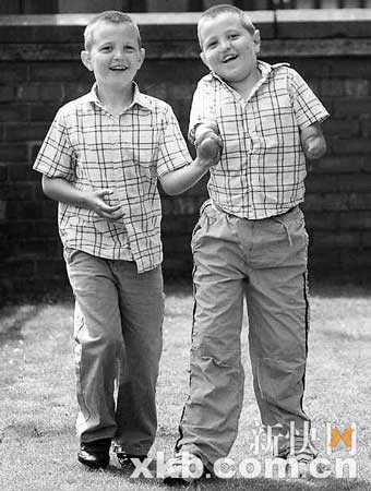 去年5月,愛德華最終戰勝病魔,身體狀況也奇跡般地好了起來。過去1年來,堅強的愛德華從未因失去雙腿和雙手而沮喪哭泣,而是以積極樂觀的態度面對。5月初,愛德華在諾丁漢市的醫院,首次安裝上了一套價值數萬英鎊的高科技“人工假腿”。有趣的是,愛德華一直希望自己能比雙胞胎哥哥威廉更高一些,因此他特意要求醫生將他的“新腿”做得更長一些。現在,他比威廉高了大約5.08厘米。
