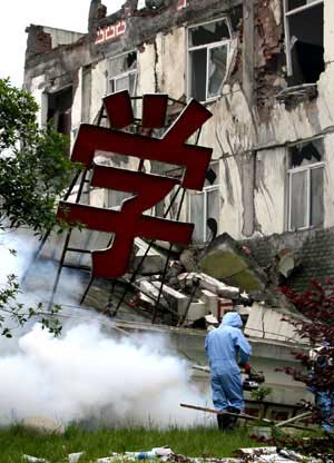路旁,新的遇難者遺體被尸袋裹著一字排開;不遠處,來自綿陽市的衛(wèi)生防疫人員組成各路小分隊,分片包干地在這座被地震完全摧毀的縣城各個角落噴灑消毒水、殺蟲劑。