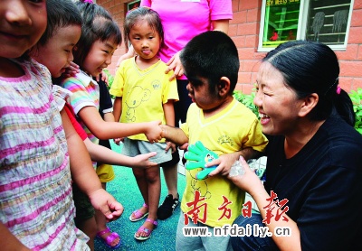 昨日早上10點多鐘,“毛孩”穿上新校服、背上新書包,來到了梧桐山中英文幼兒園,他歡喜地玩起了滑滑梯。幼兒園的小朋友們給“毛孩”送來了畫筆、玩具等禮物,還紛紛搶著和他握手以示歡迎。小班的馬瑞說她很喜歡這個新同學。可小毛孩似乎并沒有很快融入這個環境,只是開心地自己玩耍,跟小伙伴們交流很少。田亞華解釋,因為“毛孩”之前在河源長時間處在一個比較與外界封閉的環境,因此突然進入新環境要有一個適應過程。“對毛孩的最高救助目標是,通過對他的教育,使他能夠在某一個領域有所長,以此來消抵其體貌缺陷,讓他到16歲之后,自己能夠要求不脫毛,能夠充滿自信地正視自己的體貌特征,甚至認為‘全身長毛’就是他的標志。”田亞華說。