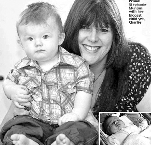 英國西約克郡彭特弗萊克市41歲女教師斯蒂芬妮·蒙頓16年前生下第一個女兒安布時,她以為自己生下了一個“巨嬰”,因為安布生下來竟重達9.6斤。然而令斯蒂芬妮做夢也沒想到的是,她又接連生下了另外3個兒女,并且這些孩子就像暗暗較勁一樣,出生時一個比一個重,斯蒂芬妮最小的孩子、如今7個月大的查利出生時竟重達12斤!斯蒂芬妮發誓以后再也不敢懷孕了,因為她無法想象如果自己再生第5個孩子,這個孩子的體重將會多驚人。