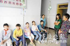 莫非食物中毒?校長黃亮立即將情況上報,并和老師將幾個學生帶到鎮衛生院檢查。很快,出現腹痛等癥狀的學生越來越多,擠滿了衛生院。
