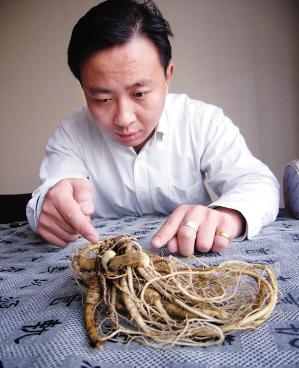 記者看到,這棵參的根須部分是卷成一團的,在主根旁還長著四根較粗的根,這些根上還有許多細長的須,顏色為土黃色。以團狀出現的山參長約20厘米,寬約10厘米,根須上有一些小疙瘩狀的小結。李先生說,就為了鑒定這棵山參的價值,幾天前他們特意來到北京。他們曾拿著山參的照片來到北京一個知名藥堂,藥堂里的一位藥材專家告訴他們這棵參至少有百歲高齡,幾個較粗的根莖可以稱為“四世同堂”,可以說十分罕見,這讓他們對山參的價值信心倍增。